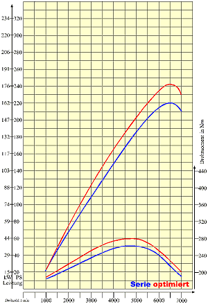 Left scale Power in kW and PS (HP). Right scale Torque in Nm (x 0.738 = lbft).