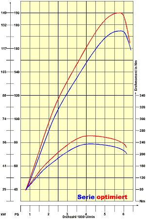 Left scale Power in kW and PS (HP). Right scale Torque in Nm (x 0.738 = lbft).